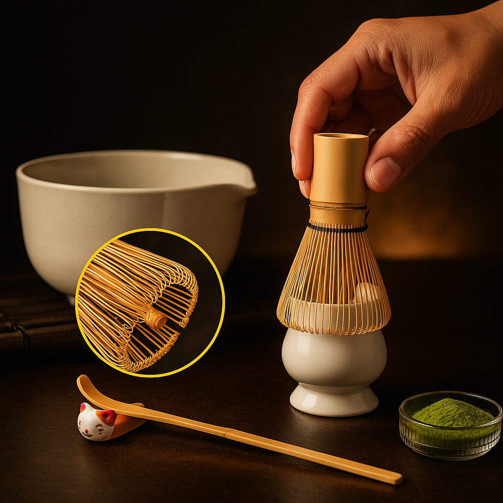 Der handgefertigte Chasen aus feinstem Bambus ist das Herzstück jeder traditionellen Matcha-Zubereitung. Mit seinen 80 filigranen Streben schlägt er den charakteristischen, samtig-cremigen Schaum auf, der echten Matcha unverwechselbar macht.